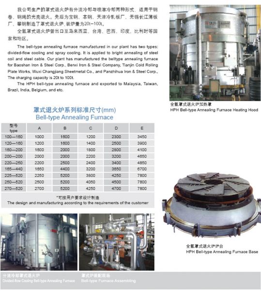 详细摘要: 我公司生产的罩式退火炉有分流冷却与喷淋冷却两种形式,适用于钢卷、钢绳的光亮退火。先后为宝钢、本钢、天津冷轧板厂、无锡长江薄板厂、攀钢制造了罩式退火炉,装炉量为20t-100t。